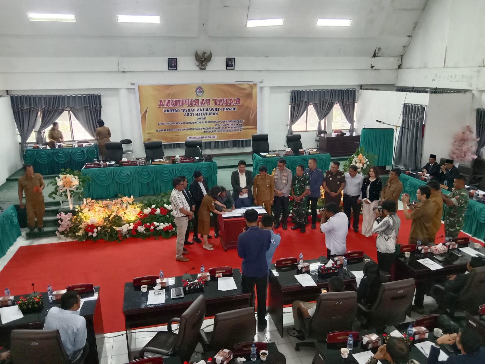 Dewan Perwakilan Rakyat Daerah Kabupaten Toba menggelar Paripurna Pengumuman Usulan Akhir Masa Jabatan Bupati/Wakil Bupati Kabupaten Toba Masa Jabatan 2021-2025 dan Pengumuman Penetapan Pasangan Bupati dan Wakil Bupati Toba Terpilih Hasil Pemilu Serentak Tahun 2024 di gedung DPRD Toba, Senin (10/2/2025).
